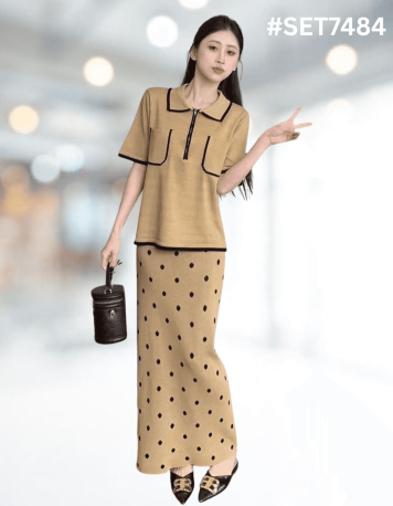 Zipper Contrast Top n Dotti Long Skirt Knit Set